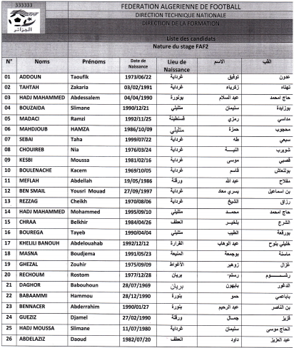 تدعو المديرية الفنية للرابطة الولائية لكرة القدم غرداية جميع المتربصين في القائمة آدناه تسديد حقوق التربص المقدرة بمبلغ 35.000.00 دج لإجراء التجمع الثاني لنيل شهادة مدرب فدرالي ثاني ، FAF2 )S2)وذلك قبل تاريخ 09 افريل 2026 ووضع وصل التسديد بآمانة الرابطة .