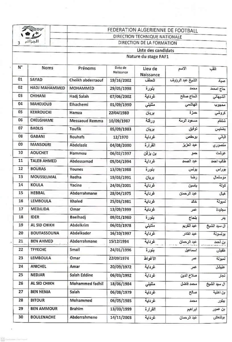 تدعو المديرية الفنية للرابطة الولائية لكرة القدم غرداية جميع المتربصين في القائمة آدناه أنه تم تحديد تربص المدربين FAF1 (S1) بتاريخ 20 افريل 2026 إلى غاية 24 افريل 2026 بقاعة الأمير عبد القادر وسط مدينة غرداية على الساعة 9:00 صباحا .